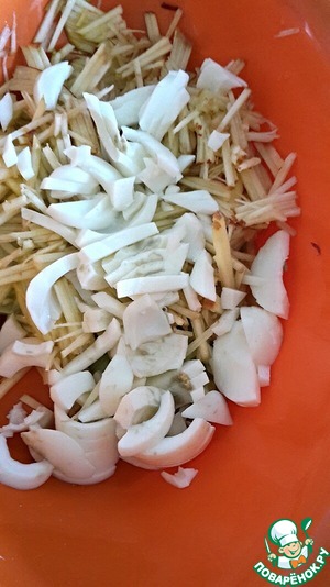 Яблоко очистим от сердцевины и натрем мелкой соломкой. Польем лимонным соком.