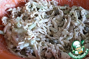 Куриную грудку разберем на волокна, добавим в салатник и польем заправкой. Хорошо все перемешаем и отправим в холодильник пропитаться.