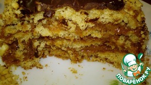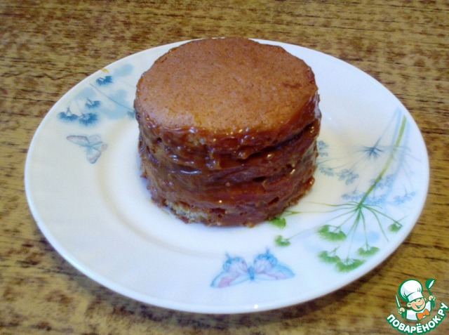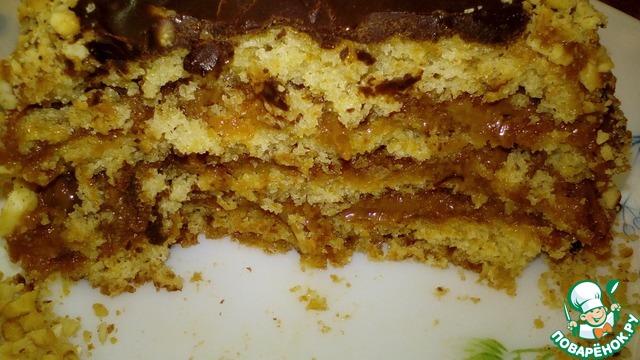 Далее выкладывается следующие коржи, пропитываются кофе и промазываются варёной сгущёнкой. Последний корж оставить сухим.
