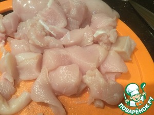 Куриное филе помойте, высушите бумажным полотенцем, нарежьте на маленькие кусочки. На той же сковороде, добавив растительное масло, жарьте, помешивая, куриное филе около 10 минут.