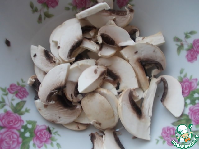 Порезать шампиньон на пластинки. У меня был один огромный, вы можете взять парочку средних на одну порцию.