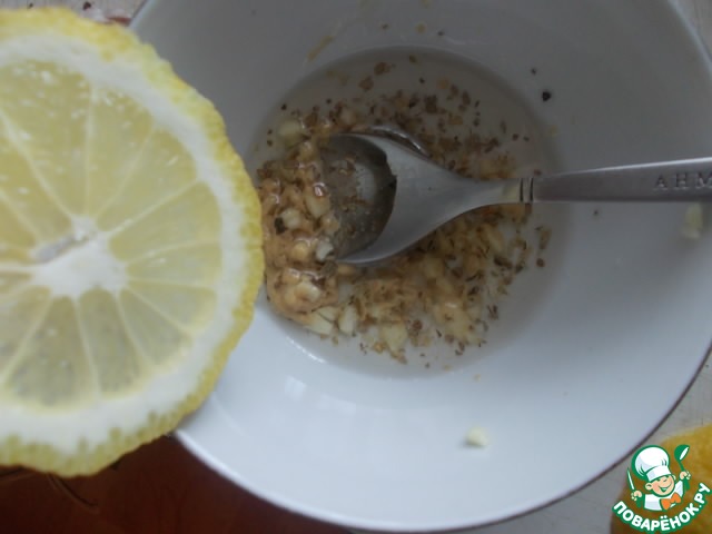 Приготовим заправку. Смешаем масло с орегано, горчицей, рубленным чесноком, при желании можно посолить. Добавить сок лимона.