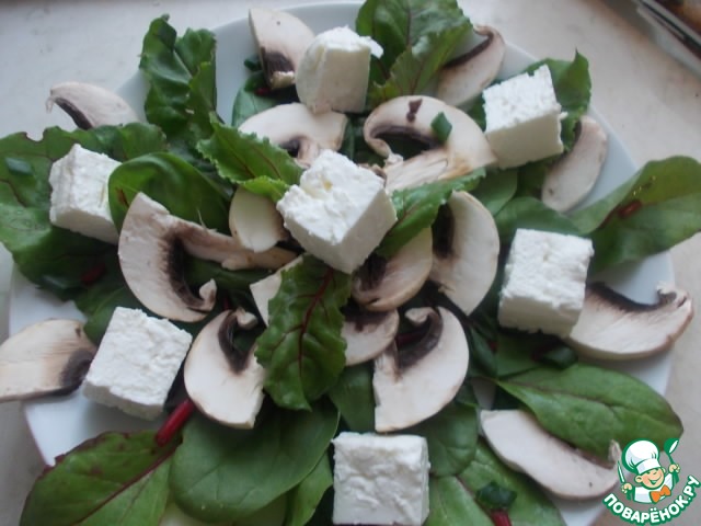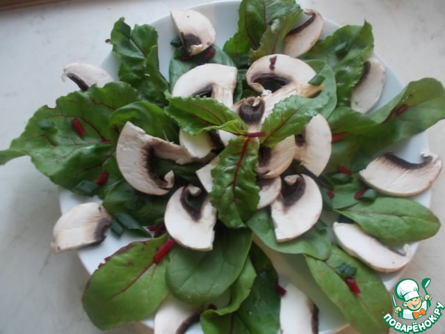 На порционную тарелку выкладываем листья свеклы, шпинат и я еще порезала стебли свеклы и зеленый лук. Добавить также грибочки в тарелку.