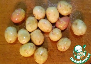 Очищаем картофель от шкурки, соскребая ее. Картофель выбираем не крупный, чуть мельче грецкого ореха.