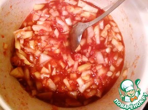 Добавляем к соку лук, смесь перцев, прованские травы, соль и сахар. Все хорошо размешиваем. Должен получиться кисло-солено-сладкий вкус. Кому как нравиться, регулируйте.