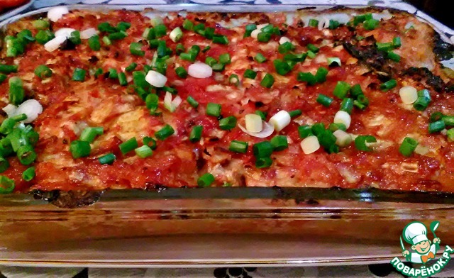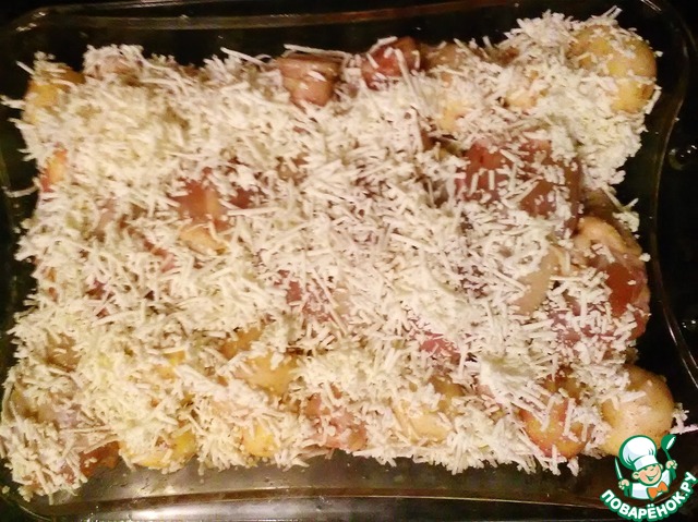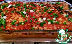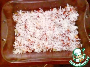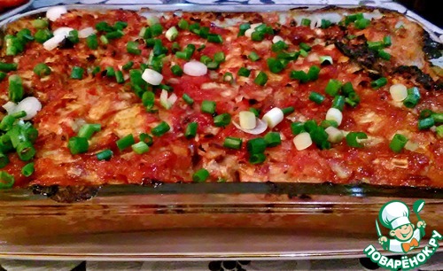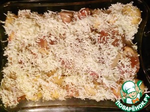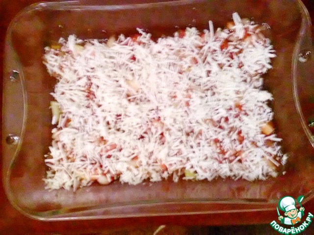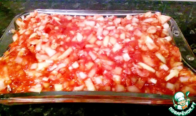 Далее начинаем складывать все в посуду для запекания. Первым слоем, будет томатно-луковая подушка. Сверху посыпаем брынзой