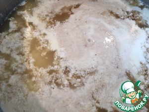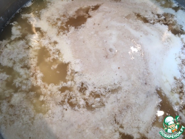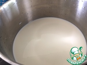 Нагревайте молочно-кефирную смесь до отслоения сыворотки.