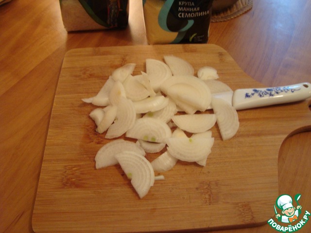 Делаем начинку. Параллельно с тестом ставим варить рис в подсоленной воде, как указанно на упаковке, до готовности. Режем лук полукольцами. Лука можно взять и больше.