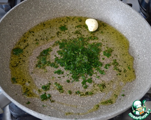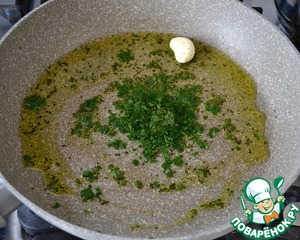 • Первым делом приготовить начинку. Для этого очистить грибы и нарезать не очень мелко. Петрушку измельчить. В глубокой сковороде разогреть оливковое масло (1 ст. л.), положить зубчик чеснока и петрушку.