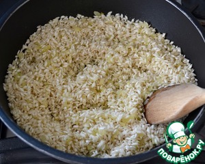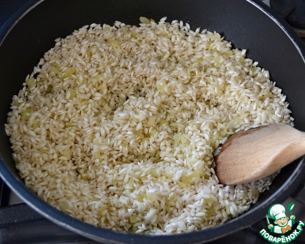 • Мы будем готовить рис как при приготовлении обыкновенного ризотто - по тому же принципу... Лук мелко нарезать. В сковороде с толстым дном разогреть оставшееся оливковое масло и 1 ст. л. сливочного. Добавить в сковороду нарезанный лук и потушить до прозрачности. Не зажаривать! Добавить рис, перемешать и пару минут дать рису напитаться луковым ароматом.