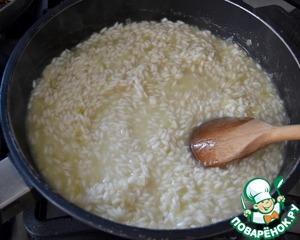 • Добавить белое вино и позволить ему выпариться. Затем, понемногу добавляя горячий бульон, варить ризотто до готовности примерно 15-17 минут.
