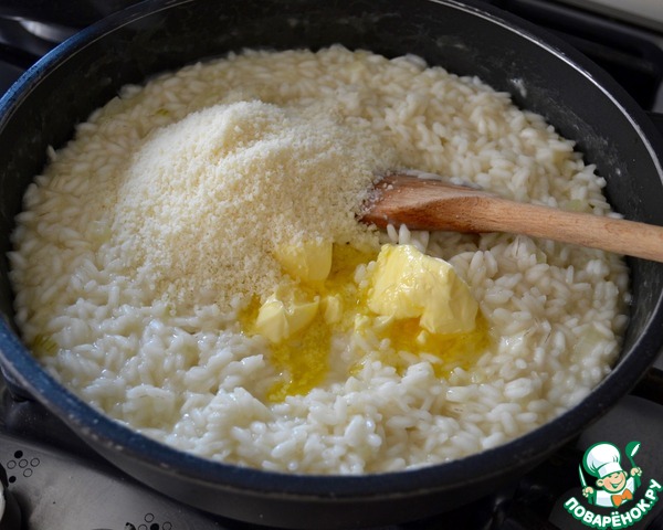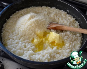 • За 2 минуты до окончания приготовления ризотто добавить в него сливочное масло и 50 г тертого сыра (типа пармезан).