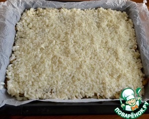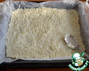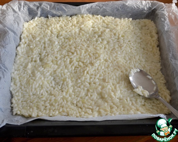 • Духовку включить на 200 С. Прямоугольную форму (30х23 см) с низкими бортиками застелить листом пекарской бумаги, предварительно смоченным в воде и как следует отжатым. Рис поделить визуально на две части. Выложить по дну формы тонким слоем первую часть риса. Разровнять ложкой.
