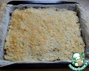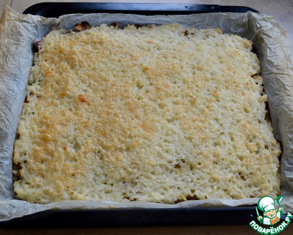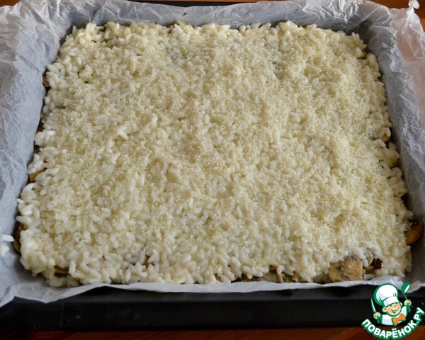 • Сверху опять рисовый слой. Присыпать поверхность оставшимся тертым сыром. И поставить в разогретую до 200 градусов духовку запекаться приблизительно на 30 минут.