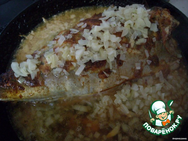 Через 30 минут полить рыбку луковым соусом и оставить в духовке на 5 минут и все готово!