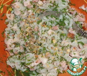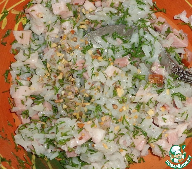 Добавляем любимый набор специй и хорошо перемешиваем. Посолить начинку по вкусу.