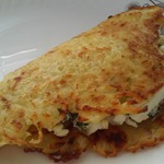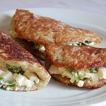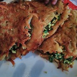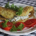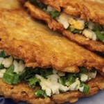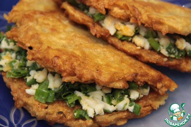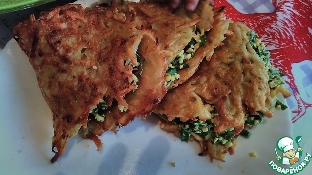 Хочу предложить вашему вниманию картофельные драники с начинкой. Мне это блюдо напомнило сочники по внешнему виду, когда немного видна начинка. Драники очень аппетитные, а начинка из яиц и зеленого лука отлично их дополняет.