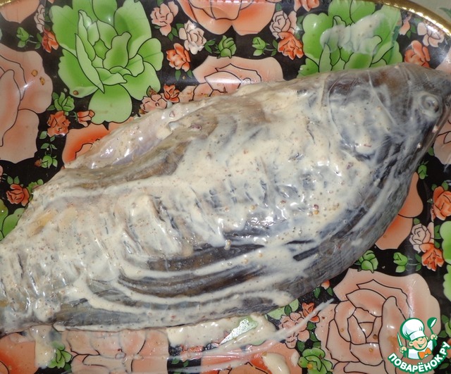 Покрыть карпа сметаной. Оставить мариноваться в холодильнике на 30 минут.