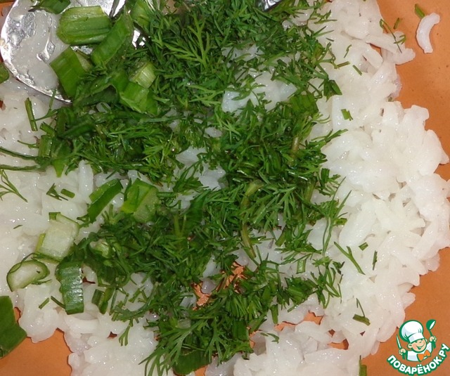 • К рису высыпать мелко порезанный укроп. Перемешиваем.