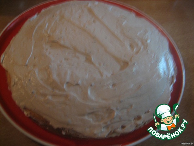 Первый корж намазываем белым кремом, укладываем 2 корж.