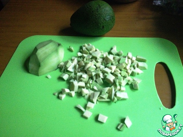 Авокадо очистить, удалить косточку, нарезать мелкими кубиками или натереть на тёрке (я один нарезала, второй - натёрла на крупной тёрке)