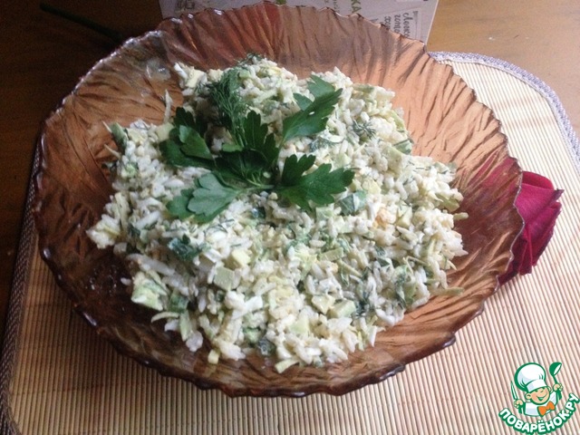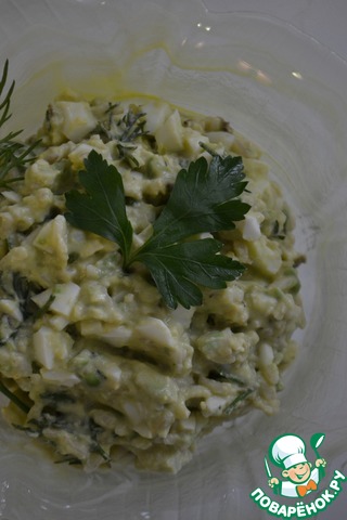 Рис смешать с авокадо, яйцом и зеленью. Заправить смесью сметаны и майонеза.