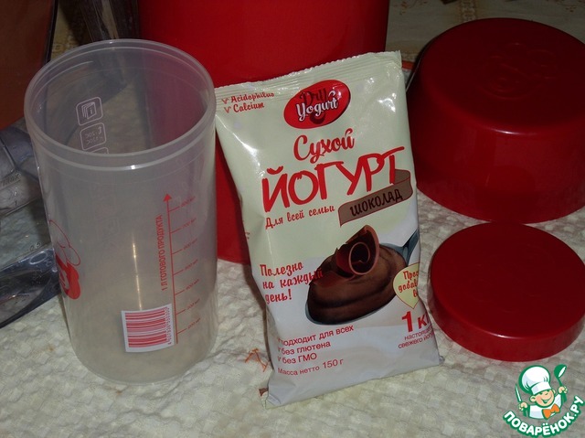Сначала я готовлю йогурт. Сделать это очень просто, используя сухие смеси для приготовления йогурта "DryYogurt" и йогуртницу - термос от компании "OURSSON". Для приготовления йогурта использую чистую воду комнатной температуры и пакет готовой сухой смеси.