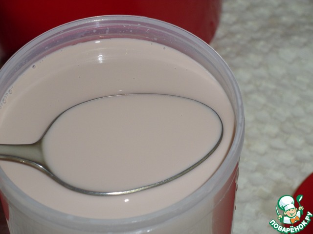 Затем добавляю оставшуюся подготовленную воду. Еще раз хорошо перемешиваю. Закрываю банку крышкой. В йогуртницу - термос наливаю горячей воды до нужной отметки. Ставлю банку с приготовленной смесью в йогуртницу - термос. Оставляю на 6-10 часов. У меня готовился 7 часов. (больше не выдержали дегустаторы)))