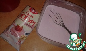 Приготовим клубничный и ванильный йогурт. Для этого в 850 мл воды комнатной температуры помешивая постепенно всыпать сухую смесь для приготовления клубничного йогурта