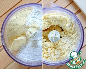 Сегодня мы печем Киш на безглютеновом тесте, используя кукурузную и рисовую муку. Постарайтесь выбрать муку мелкого помола, так тесто будет однородее, мягче и приятнее на вкус. Для приготовления теста смелите блендором в крошку кусочки сливочного масла, соль и два вида муки. Кстати про масло и соль: на самом деле проще всего использовать соленое масло. И так, в крошку добавляем ледяную воду и руками замешиваем мягкое эластичное тесто.