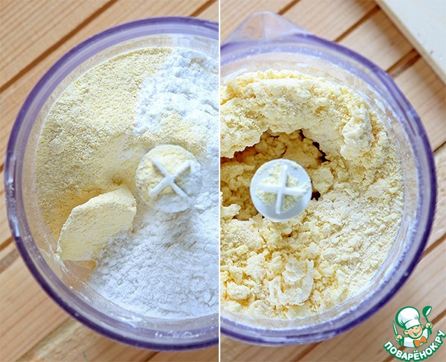 Духовку разогреваем до 200 градусов. Готовим основу: тесто получается ОЧЕНЬ ломким, работать с ним не очень просто. Лучше всего прокладывать дно формы бумагой для выпечки, бока смазать маслом и присыпать мукой и не использовать рифленый край, как на фото - тесто липучее. Тесто раскатываем и бережно, но быстро переворачиваем на форму. Перенести его практически невозможно)) Единственное - раскатать и перенести сразу на бумаге. Если все же переворачиваете, то у вас будет ровное и аккуратное дно, а остальное обвалится и дальше работаем руками, придавая основе форму. Оставшееся тесто можно потом использовать для приготовления пресного печенья.