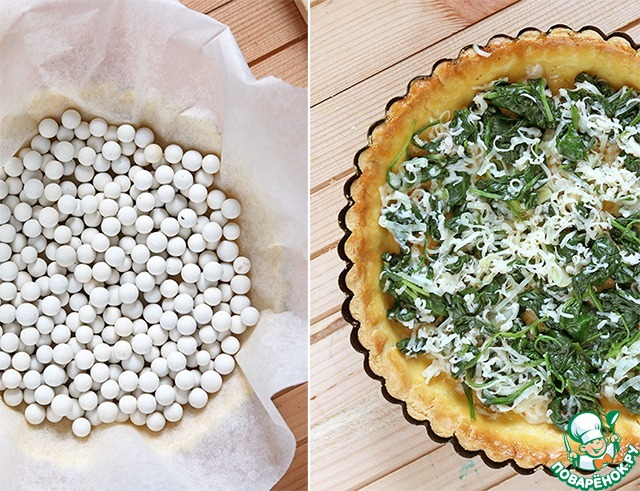 Тесто накалываем вилкой, сверху кладем бумагу для выпечки и груз (специальные шарики или бобовые), сначала убираем основу в холодильник минут на 20, за тем отправляем в духовку на 15 минут. Далее снимаем груз, смазываем основу желтком, смешанным с 1 ч. л. воды и выпекаем еще 5 минут.