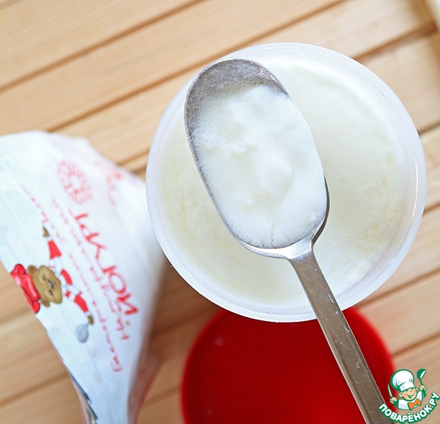 Для заливки будем использовать нежнейший йогурт, который приготовили с помощью закваски Орсик. Йогурт я готовила при помощи фирменного термоса: залила литр молока, добавила пакетик закваски, хорошо встряхнула, чтобы все перемешалось. В термос залила кипяток, поставила йомкость с молочной смесью и закрыла. Через 6-8 часов достаем емкость с йогуртом и отправляем на пару часов в холодильник. У меня йогурт не очень плотный, поскольку приготовлен на маложирном молоке.