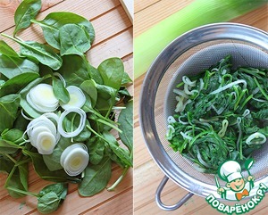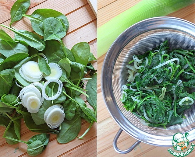 Для начинки используем свежий шпинат. Добавим к нему нарезанный лук порей и уварим на сковороде с добавлением небольшого количества воды.