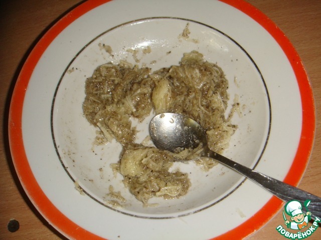 Приготовим начинку: чеснок пропускаем через пресс или трем на терке, добавляем черный молотый перец и соль, перемешиваем.