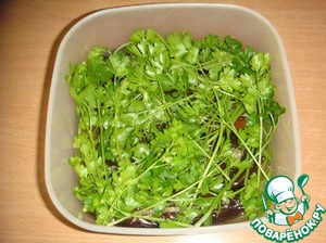 Заливаем растительным маслом без запаха. Сверху распределяем петрушку.