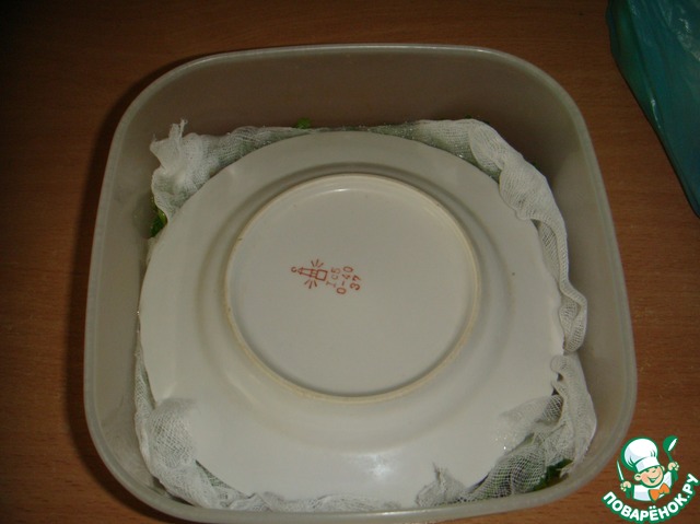 Закрываем марлей, кладем тарелку и ставим груз. Убираем на трое суток в холодильник.