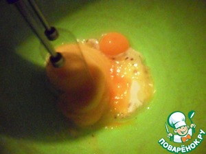 Яйца взбить с сахаром и ванильным сахаром. Тонкой струйкой влить растительное масло. Перемешать.