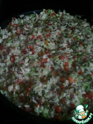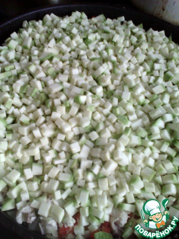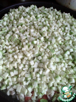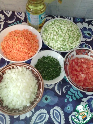 Морковь, кабачок, лук, помидор (без кожи) нарезаем мелким кубиком. Зелень и чеснок рубим как можно мельче.
