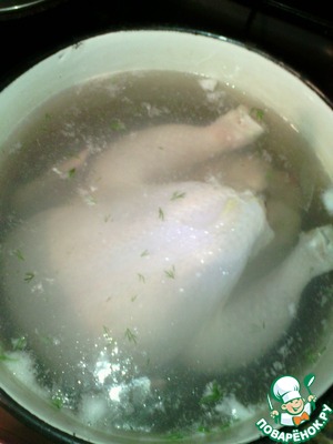 Курицу ставим варить на час-полтора в подсоленную воду. Нам нужно, чтоб легко отделялось мясо от костей.