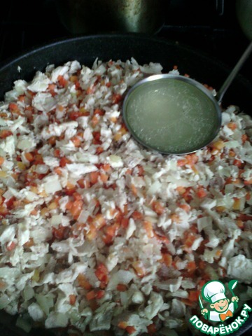 Добавляем одну поварешку куриного бульона (сверху берем, с жирком). Еще минут 5 тушим.