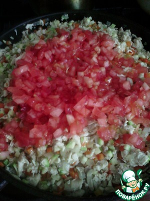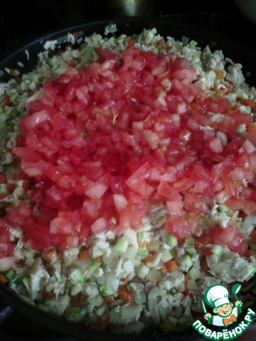 Дальше нарубленные помидоры. И ещё обжариваем около 10 минут (без крышки).