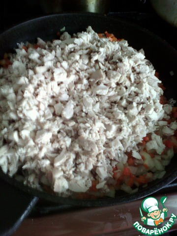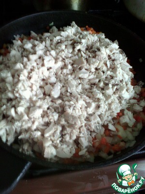 Добавляем к обжарке, мелко нарубленную мякоть курицы (я добавил всю: и грудку, и ноги, и кожу). Обжариваем еще минут 5 (огонь - средний).