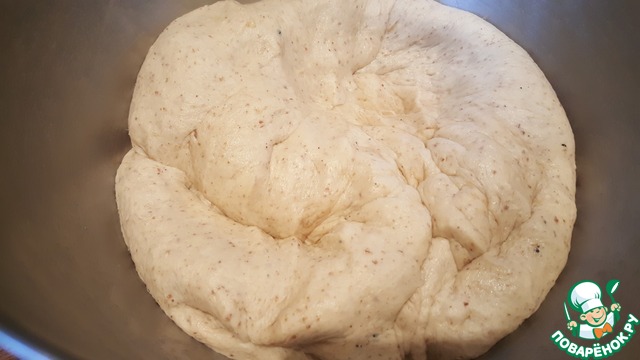 Через полтора часа тесто хорошо подошло, увеличилось в объёме в 2 раза. Следите за тестом, может понадобиться чуть меньше или чуть больше времени. Я обмяла тесто в миске. Тесто напоминает пластилин средней жесткости, немного липнет, но хорошо отлипает и я решила не добавлять больше муки.