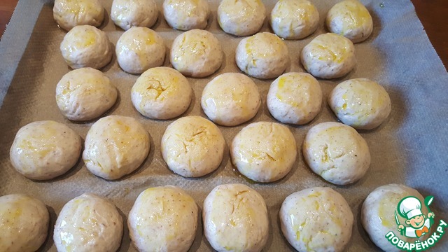Выкладываем булочки на противень, оставляя между ними расстояние в пару сантиметров. -