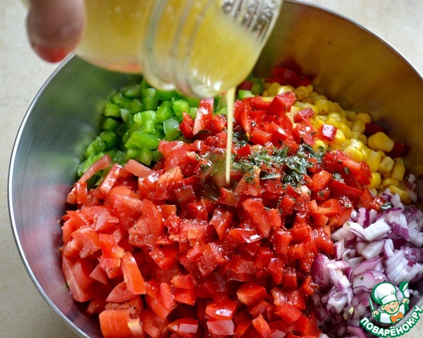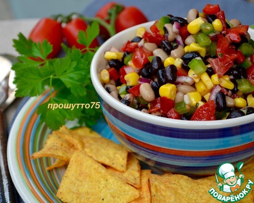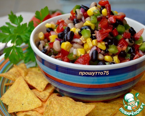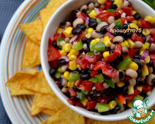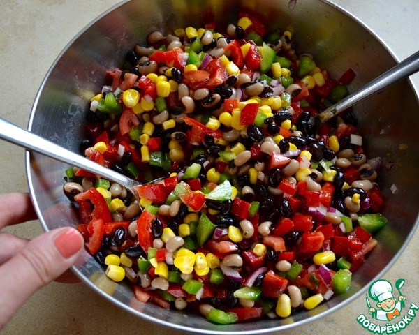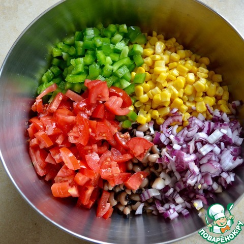 COWBOY CAVIAR. Этот вкуснейший салат из простых и доступных ингредиентов можно считать вполне универсальным; он идеален для пикника, как сопровождение к мясу, рыбе или птице. Сочетание всех ингредиентов в салате и соуса-заправки к нему очень гармонично! Почему салат называется «ковбойская икра»? Считается, что имя было дано салату не сразу, а лишь спустя несколько лет после его появления, когда он был подан гостям отеля «The Driskill». Кто-то пошутил, сравнив мелко нарезанный салат с деликатесной чёрной икрой, сказав что, возможно, это её суровый ковбойский вариант! Шутка прижилась и название «ковбойская икра» (или еще «техасская икра») закрепилось за рецептом. Существуют варианты этого изветсного салата, нам он понравился именно в таком сочетании... В состав «икры» входят два вида фасоли — «чёрный глаз» и просто чёрная фасоль (которую можно заменить на красную)! P.S. Время приготовления указано с учетом охлажедния салата!