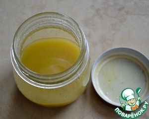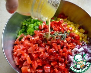 Для заправки салата тщательно смешать до состояния эмульсии все ингредиенты - оливковое масло, винный белый уксус, соль, сахар, перец чили... (по рецепту идет много сахара на указанное количество продуктов, мне идеально подошло 1 ст. л. с "горкой". Можете пробовать на свой вкус!)