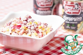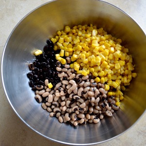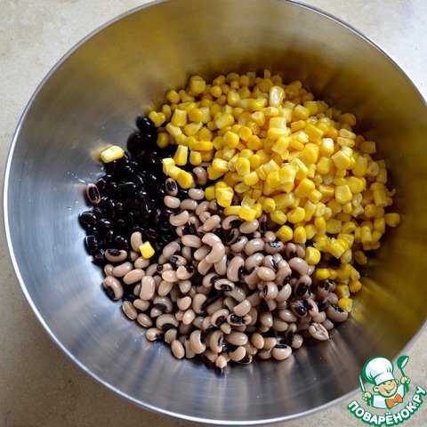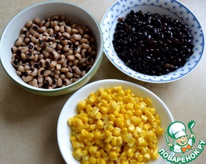 Первым делом подготовить фасоль. По рецепту предлагается взять уже готовую, консервированную, но у меня была в сухом виде именно требующаяся "черная" фасоль и фасоль "черный глаз"! Поэтому замочить оба вида фасоли на ночь в холодной воде, а затем сменить воду и отварить фасоль согласно рекомендациям производителя. Полностью остудить и промыть перед использованием (я готовлю фасоль накануне приготовления салата). Подготовить необходимое количество кукурузы (хорошего качества).