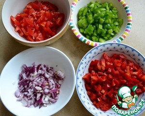 Затем, подготовить и нарезать как можно мельче все входящие в салат овощи; красный и зеленый сладкий перец, красный лук, помидоры.