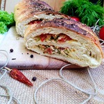 Сверните рулетом. Хорошо защипайте шов и концы. Посыпьте верх специями и солью, сделайте надрезы острым ножом и оставьте на 10-15 минут для подъема